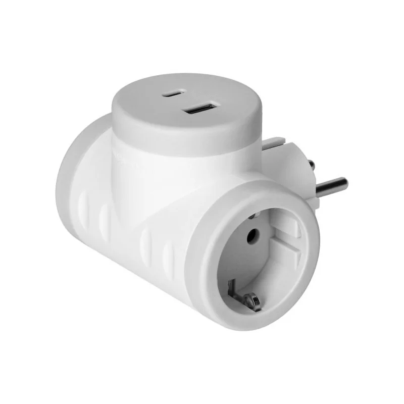 Rozgałęźnik elektryczny pozwala na jednoczesne podpięcie dwóch urządzeń elektrycznych oraz korzystanie z gniazda USB A oraz USB C. Gniazda ładujące USB wyposażone są w technologię Quick Charge 2.0 PD, która umożliwia szybkie i bezpieczne ładowanie urządzeń, a wszystko to dzięki zapewnieniu kontroli napięcia i prądu podczas ładowania. Urządzenie przystosowane jest do pracy z prądem 16 A - 230 V i wytrzymuje obciążenie maks. 3680 W. Dostępna wersja kolorystyczna - biało-szara. Model z uziemieniem typu Schuko.