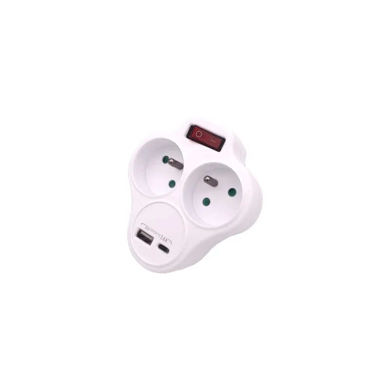 Rozgałęźnik sieciowy Z-12 marki RUM-LUX, przeznaczony do rozdzielenia zasilania z pojedynczej wtyczki sieciowej na aż trzy różne urządzenia. Gniazda sieciowe wyposażone w uziemienie, gniazda USB i USB-C szybko ładujące. Wbudowany włącznik pozwala na wyłączenie zasilania urządzeń bez ich odłączania. Klasyczny, biały kolor obudowy sprawia, że produkt będzie pasował do każdego wnętrza. Wyłącznik wyłącza wszystkie gniazda 230V i USB.
