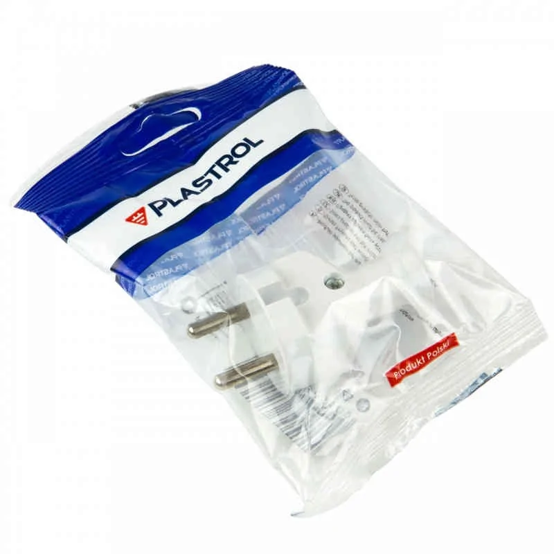 Prosta rozbieralna wtyczka marki PLASTROL w kolorze białym przeznaczona do gniazd bez uziemienia