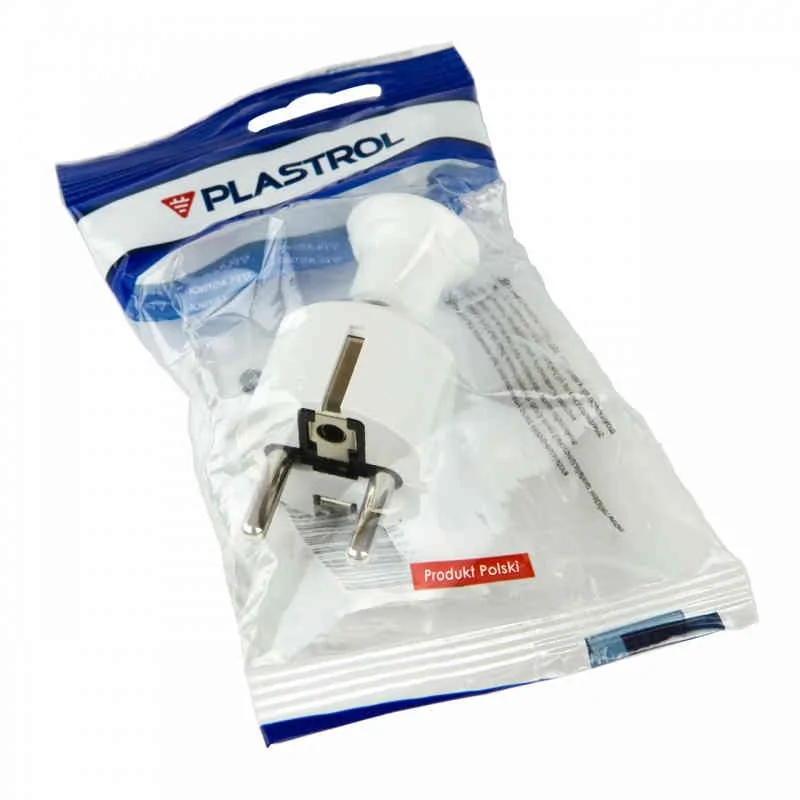 Wtyczka rozbieralna marki PLASTROL z uziemieniem w kolorze białym pasuje do każdego typu gniazd stosowanych w Polsce.