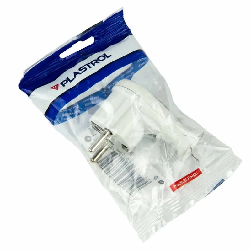 Wtyczka kątowa marki PLASTROLw kolorze białym przeznaczona do gniazd z uziemieniem wykonana została z tworzywa sztucznego. Rozbieralna wtyczka przeznaczona jest do bolca ochronnego. Rodzaj połączenia stanowią zaciski śrubowe.