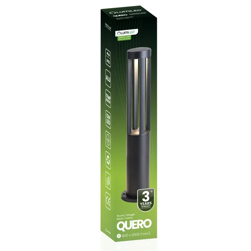 Lampa ogrodowa QUERO producenta LUMILED, to elegancki i funkcjonalny słupek zewnętrzny o wysokości 80cm, stworzony z myślą o stylowym i efektywnym oświetleniu Twojego ogrodu, tarasu czy podjazdu. Wyposażona w zaawansowane źródło światła LED o mocy 12W, zapewnia jasne i przyjemne neutralne światło o temperaturze barwowej 4000K, idealne do oświetlenia zewnętrznego. Wolnostojący słupek ogrodowy to doskonały wybór dla osób poszukujących stylowego i niezawodnego oświetlenia zewnętrznego, które nie tylko oświetli, ale także upiększy Twoją przestrzeń ogrodową. Oświetlenie zewnętrzne o nowoczesnej formie wykonane zostało z aluminium w kolorze czarnym. Stopień ochronny to IP65, co gwarantuje odporność na czynniki zewnętrzne. Produkt objęty gwarancją producenta.