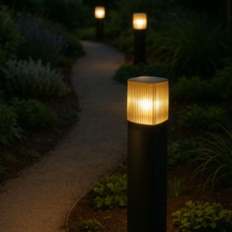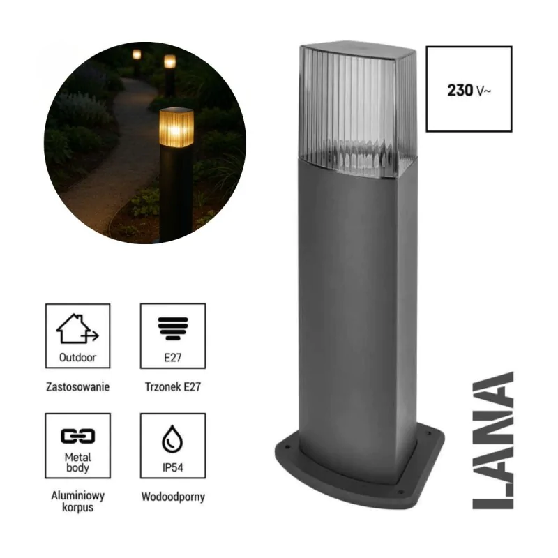 - Spójna kolekcja oświetlenia ogrodowego: Seria LANA obejmuje kinkiety oraz słupki