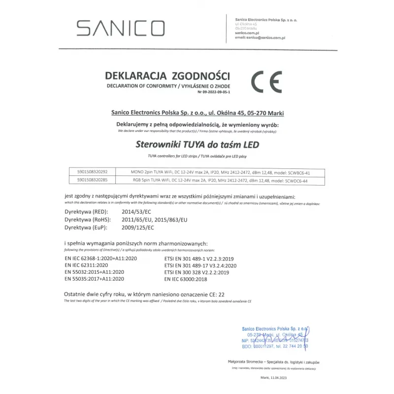 Sanico Electronics Polska Sp. z o.o. oświadcza, że urządzenia radioelektryczne wymienione w niniejszej instrukcji są zgodne z dyrektywą 2014/53/WE.