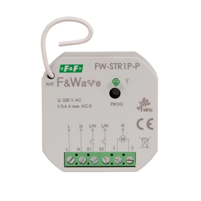 Sterownik FW-STR1P-P to nowoczesne rozwiązanie do zdalnego sterowania roletami, markizami i żaluzjami wyposażonymi w silniki 230V AC. Urządzenie pracuje w ramach systemu F&Wave – niezawodnej technologii radiowej, która umożliwia lokalne oraz centralne sterowanie roletami w całym domu za pomocą pilotów, przycisków naściennych (monostabilnych), szklanych paneli dotykowych czy breloków.