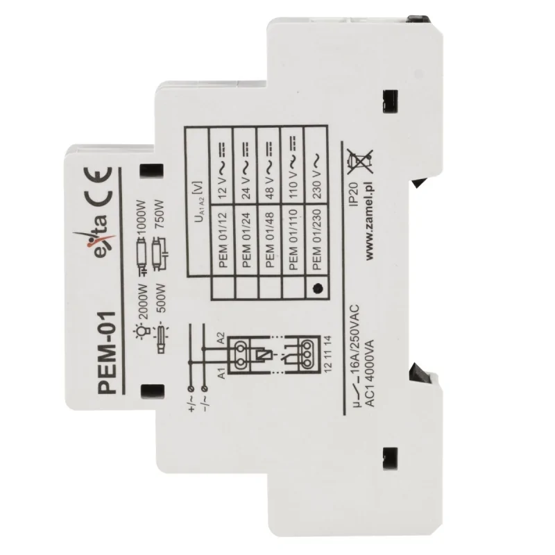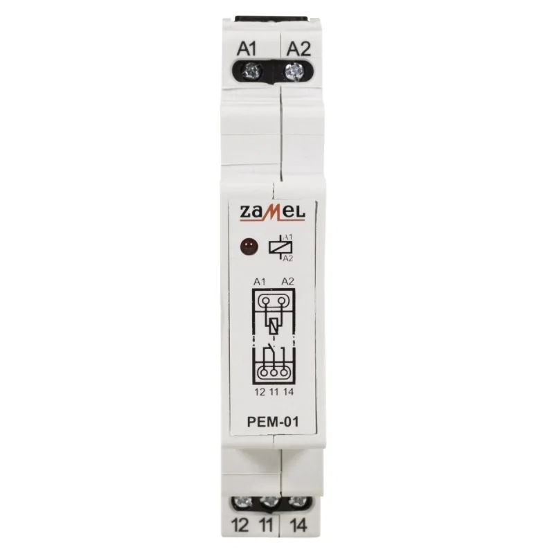 Przekąźnik elektromagnetyczny PEM-01 Zamel służy do zwiększania prądów obciążenia odbiorników. Jest to przekaźnik jednotorowy posiadający na wyjściu styki beznapięciowe NO/NC, pozwalające na podłączenie napięcia 230 V AC. Przekaźnik