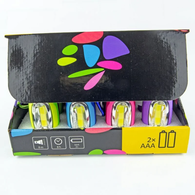 Lampka z breloczkiem marki EMOS to funkcjonalny gadżet oświetleniowy występujący w czterech, modnych, wyrazistych kolorach ( zielony, niebieski, różowy, fioletowy). Świecący breloczek do kluczy zasilany dwiema bateriami 1,5V AAA jest w stanie przepracować nawet osiem godzin. Moc strumienia świetlnego breloczka led sięga nawet 30 lumenów, przy 8 metrowym zasięgu świecenia. Świecący brelok do kluczy led to nie tylko doskonała przywieszka do kluczy ułatwiająca lokalizacje zamka w ciemnym korytarzu ale również idealny element oświetleniowy znajdujący swoje przeznaczenie przy plecaku dziecięcym, zwiększając tym samym jego bezpieczeństwo na drodze w zimowe popołudnia.