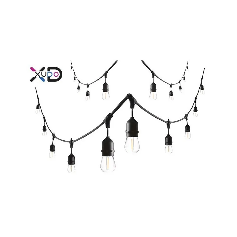 Czarna girlanda ogrodowa marki LVT o długości 20 metrów to eleganckie i nowoczesne rozwiązanie na dekorację Twojego ulubionego miejsca. Idealnie spisze się jako oświetlenie dekoracyjne w altanach, na tarasach czy balkonach. Dodatkowo przyjemna ciepła barwa światła o temperaturze barwowej 2700K nada niepowtarzalnego nastroju każdemu otoczeniu. Czarna 20-metrowa girlanda wyposażona została w 20 ciepłych żarówek LED z filamentem z gwintem E27, o mocy 1W (20x1W). Łańcuch świetlny ogrodowy wyposażony został w podwyższony stopień szczelności IP44, dzięki czemu odporny jest na różne warunki panujące na zewnątrz. Żarówki umieszczone zostały w odległości 100cm od siebie.