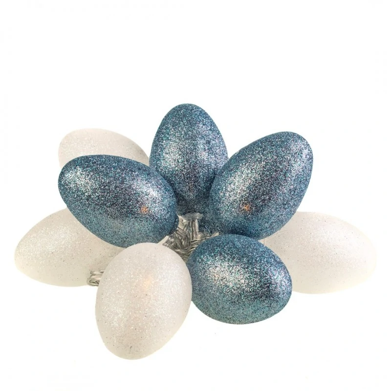 Wielkanocna dekoracja EKD3938 w kształcie jajek to propozycja od Polskiej marki EKO-LIGHT. Jajka wykonane są z plastiku w kolorze białym i szarym, delikatnie osypane są brokatem, a ich wielkość wynosi 6cm/4cm. Transparentny kabel mierzy 1,6m długości. Dekoracja posiada wbudowane diody LED. Produkt zasilany jest bateriami, które są dołączone do zestawu. Girlanda przeznaczona jest tylko do użytku w pomieszczeniach. Dostępna jest w różnych kolorach.