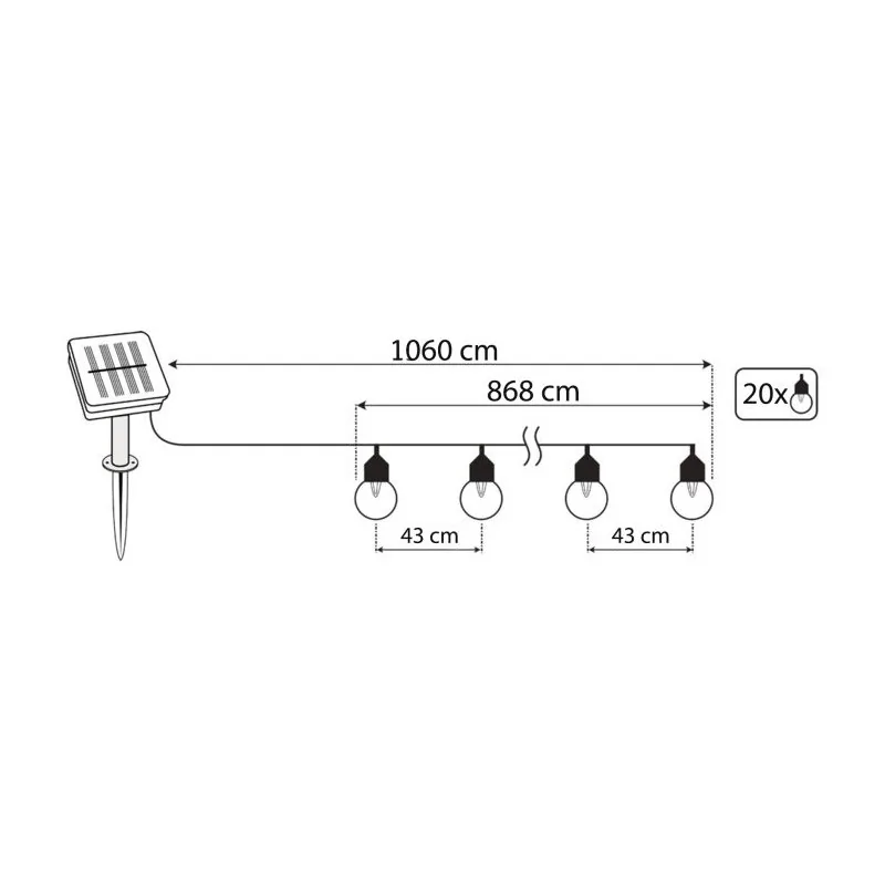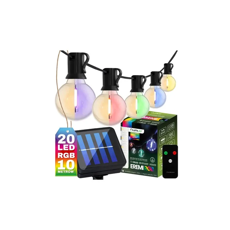 Girlanda, łańcuch solarny z dwudziestoma żarówkami w kształcie kulki G50 w kolorze przezroczystym z nietłukącego tworzywa z serii EREMI znanej i renomowanej w branży oświetleniowej marki LUMILED. Girlanda ogrodowa została stworzona, aby służyć jako dekoracja, której celem jest nie tylko oświetlanie przedmiotów, ale także ich eksponowanie. Wbudowany czujnik zmierzchu - samodzielnie uaktywnia oświetlenie po zmierzchu, dzięki temu wieczorową porą bezpiecznie przejdziesz pięknie oświetloną ścieżką. Lampka solarna wyposażona jest w przełącznik mechaniczny ON/OFF, który włączamy jeden raz, dzięki technologii lampka sama będzie się włączać i wyłączać w zależności od pory dnia. Girlanda solarna Eremi pomoże zaoszczędzić rachunki za prąd. W słoneczny dzień można ją w pełni naładować i używać przez około 8 godzin. W przypadku zachmurzenia lub deszczu panel można ładować przez złącze USB, dzięki czemu girlandę można używać również w zimie bez wystarczającej ilości światła słonecznego. Ten model świeci biała ciepłą barwą lub kolorowym światłem RBG. Do zestawu dołączony pilot. Długość całkowita to ok 10m. Panel solarny girlandy posiada dwie możliwości montażu ( wbijany lub naścienny -kołki i szpikulec w zestawie)
