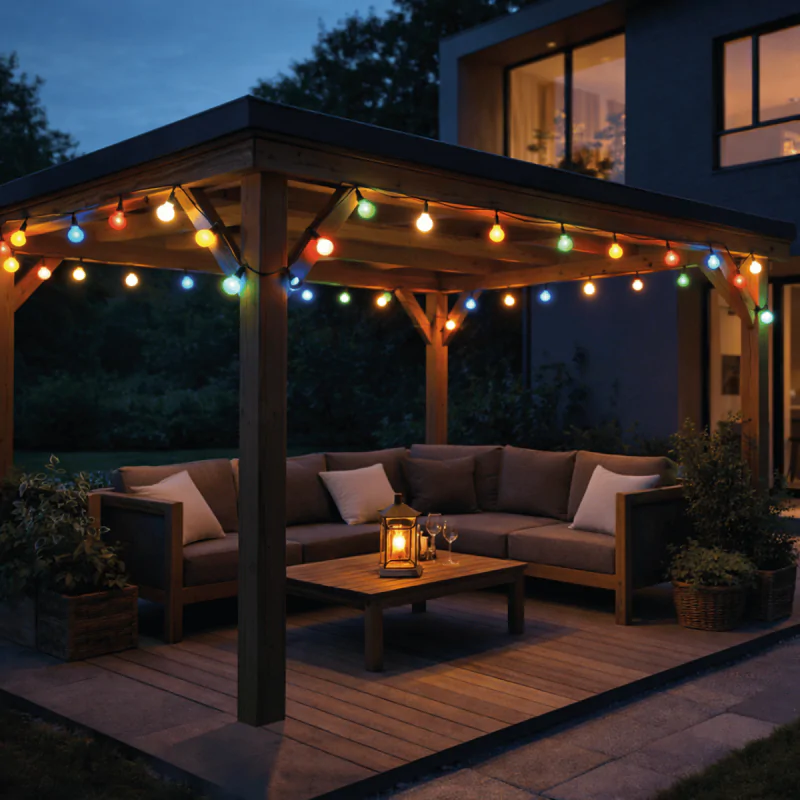 - Dekoracyjne oświetlenie LED: Kolorowe światło tworzy przyjemny klimat w ogrodzie, na tarasie lub balkonie, idealny na wieczorny relaks i spotkania na świeżym powietrzu.
