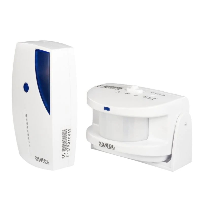 Sygnalizujący dzwonek z czujnikiem ruchu NT-320 w kolorze białym firmy ZAMEL to doskonałe rozwiązanie dla takich obiektów jak sklepy, biura lub recepcje hotelowe, służące do powiadamiania o pojawieniu się osoby w danym rejonie lub pomieszczeniu. W skład zestawu wchodzi bezprzewodowy czujnik ruchu, z możliwością samodzielnej pracy, który może pełnić funkcję mini alarmu. Odbiornik posiada 32 dźwięki i melodie do wyboru, które dodatkowo są sygnalizowane optycznie wbudowaną diodą. Dzwonek posiada pięciostopniową regulację poziomu głośności o maksymalnym poziomie dźwięku wynoszącym 85 dB. Zasięg działa urządzenia NT-320 SUNDI w terenie otwartym to około 100 metrów. Do zasilania odbiornika zastosowane są dwie baterie 1.5 V AAA natomiast nadajnika trzy baterie 1.5 V AAA.