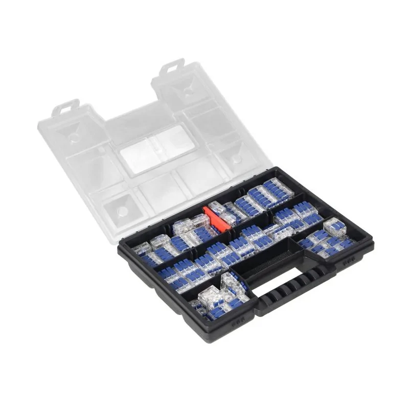 Zestaw złączek instalacyjnych zaciskowych zawierający 89 sztuk. Złączki wykonane z wysokogatunkowego tworzywa sztucznego. Wszystkie produkty umieszczone są w wygodnym i trwałym pudełku z rączką, zamykanym na klik. Komplet złączek to idealny zestaw na prezent. Zestaw zawiera następujące złączki zaciskowe: