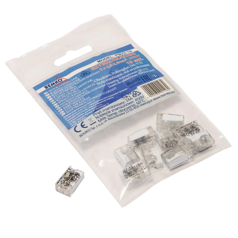 Szybkozłączki firmy Bemko wykonane z poliwęglanowej obudowy z miedzianymi stykami ze stali ocynkowanej z dwoma polami wejściowymi o średnicy od 0.5 do 2.5mm sprzedawane po dziesięć sztuk w opakowaniu. Można ich używać z typowym zakresem napięć obudowy wynoszącym do 450 V w zakresie instalacji o maksymalnym prądzie znamionowym równym 24A.
