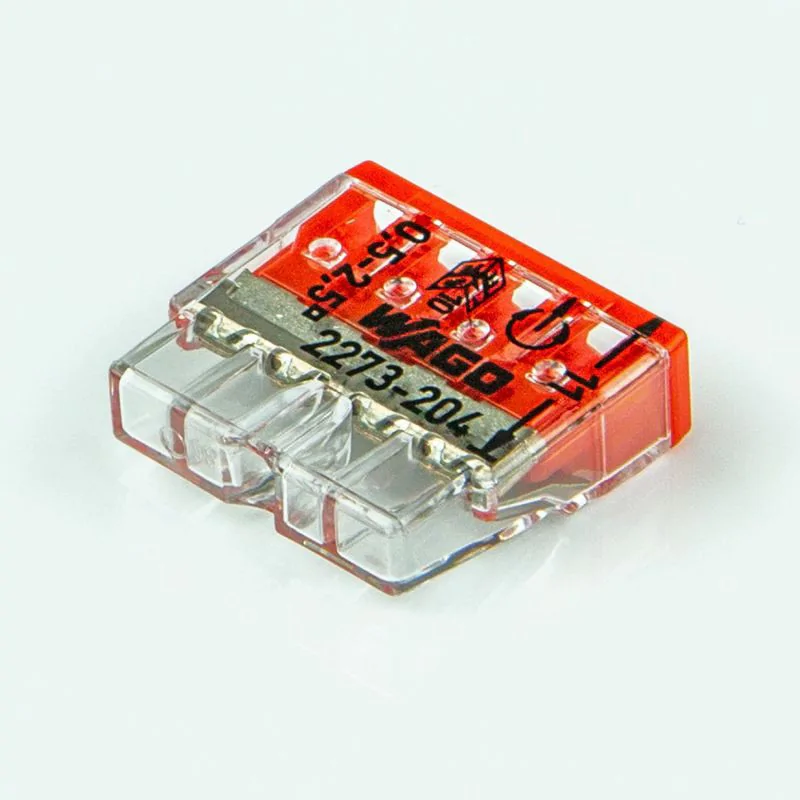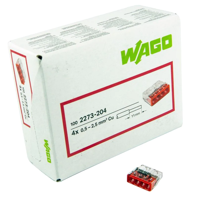 Złączka instalacyjna 2273-204 firmy WAGO jest w kolorze transparentym, a jej pokrywa jest w kolorze czerwonym. Szybkozłączki sprzedawane są pojedynczo (w opakowaniu 100szt). Złączka instalacyjna firmy WAGO jest wyposażona w cztery zaciski o przekroju przewodów podlączeniowych 0,5-2,5 mm2. Szybkozłączka posiada odizolowanie przewodu o długości 11 mm, a jej wymiary to: 18 x 16,7 x 5,8 mm. Prąd znamionowy szybkozłączki jest równy 24A i działa z napięciem 450V.