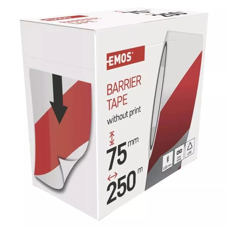 Czerwono-biała taśma do wytyczania bez kleju, wykonana z polietylenu o małej gęstości (LDPE) z ukośnymi pasami. Służy do oznaczania wykopów, do wytyczania placów budowy, tras sportowych, różnych niebezpiecznych miejsc i innych przestrzeni.Taśma sprzedawana w kartonowym opakowaniu do odwijania znajduje się w pudełku, z którego jest wyciągana. Odwijanie i operacje z taśmą za niezwykle proste, rolka taśmy nie może się gdzieś potoczyć, a taśma nie może się zaplątać. Długość taśmy to 250 m, a jej szerokość to 75mm.