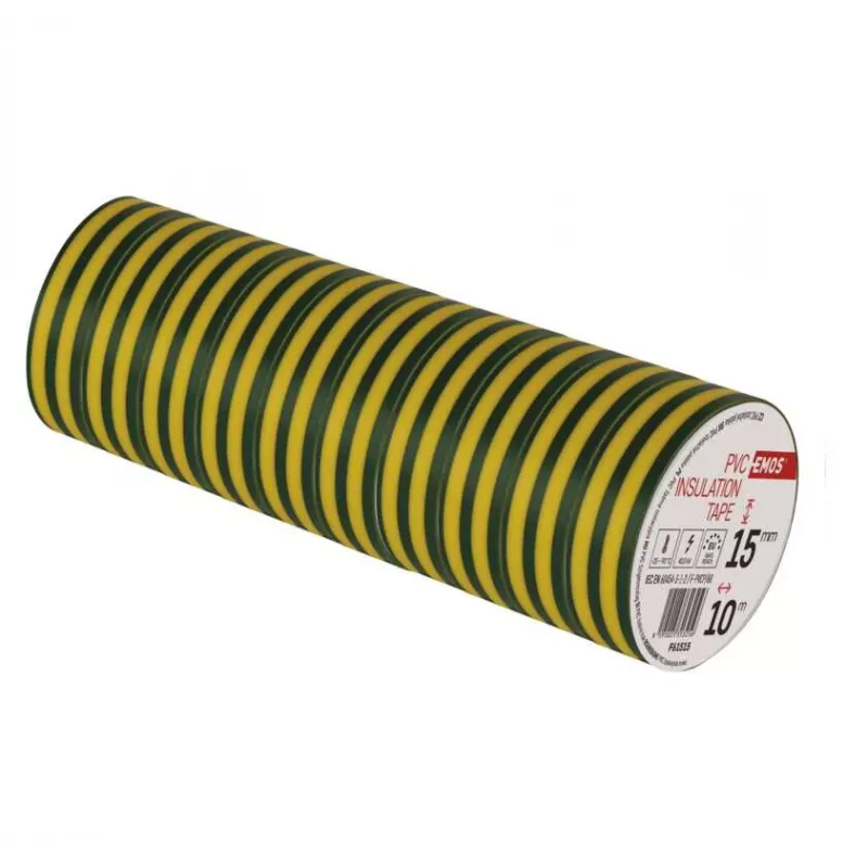 Taśma izolacyjna marki EMOS w kolorze zielono-żołtym o szerokości 15mm i długości 10m wytrzymała jest na szeroki zakres temperaturowy obejmujący od -25 do nawet 90 stopni Celsjusza. Taśma spełnia wymagania dyrektyw ROHS oraz REACH. Taśma izolacyjna doskonale sprawdza się jako izolacja różnego rodzaju przewodów. Ze względu na uniwersalny zielono-żółty kolor taśma izolacyjna świetnie dopasuje się do większości przewodów elektrycznych.