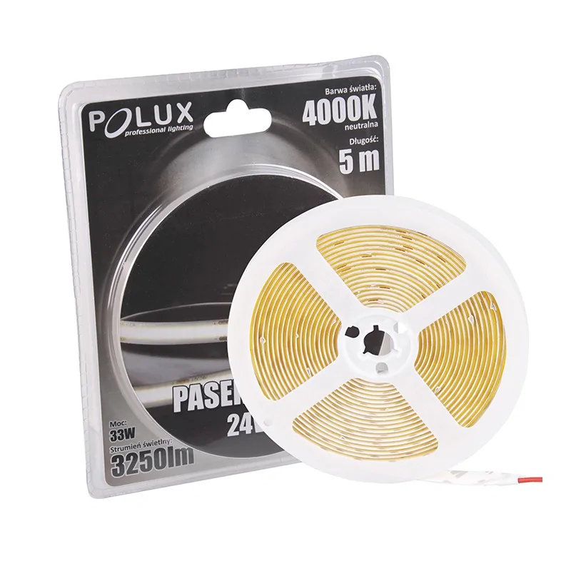 Taśma LED marki POLUX to świetna dekoracja pomieszczeń czy mebli. Produkt charakteryzuje się wysoką wydajnością światła przy niskim zużyciu energii. Prezentowana taśma led jest o długości 5m i oddaje neutralne białe światło o temperaturze barwowej 4000K i strumieniu świetlnym równym 3250 lumenów. Do produktu należy osobno dokupić zasilacz stabilizowany do taśm led 24V ≥ 1,5A 36W (zalecany 317346 Polux). Taśma led działa z mocą 33W, a szacowany czas działa zintegrowanych w niej diod led to około 25000h oraz 15000 cykli włączeń i wylączeń.