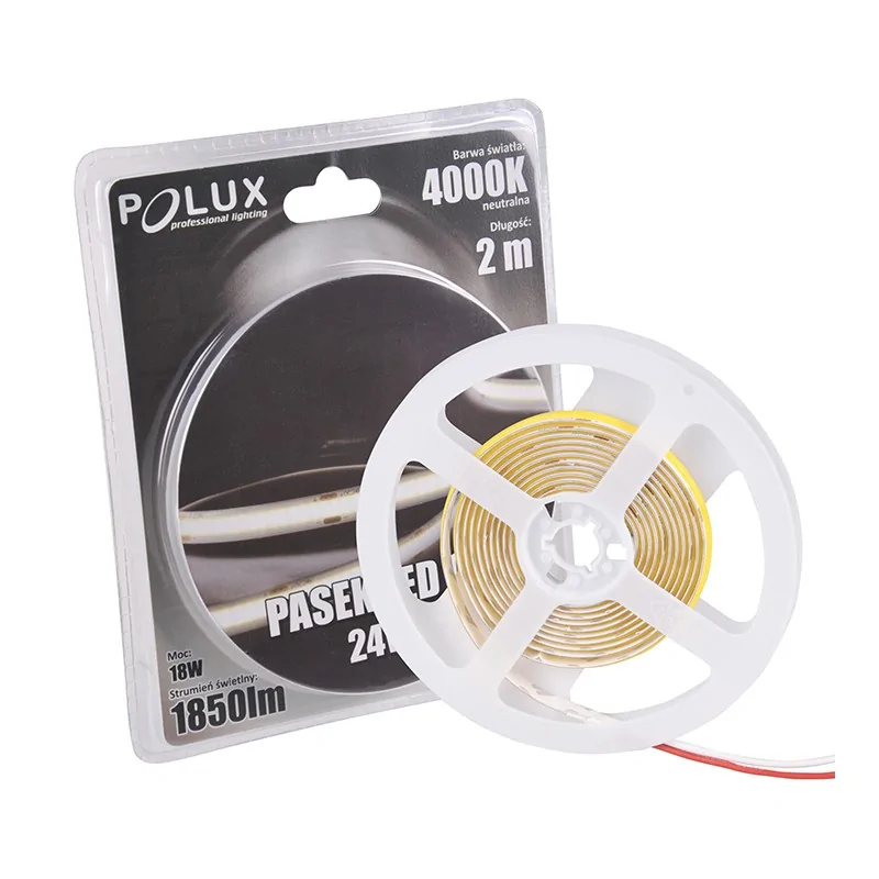 Taśma LED marki POLUX to świetna dekoracja pomieszczeń czy mebli. Produkt charakteryzuje się wysoką wydajnością światła przy niskim zużyciu energii. Prezentowana taśma led jest o długości 2m i oddaje neutralne białe światło o temperaturze barwowej 4000K i strumieniu świetlnym równym 1850 lumenów. Do produktu należy osobno dokupić zasilacz stabilizowany do taśm led 24V ≥ 1,5A 36W (zalecany 317346 Polux). Taśma led działa z mocą 18W, a szacowany czas działa zintegrowanych w niej diod led to około 25000h oraz 15000 cykli włączeń i wylączeń.