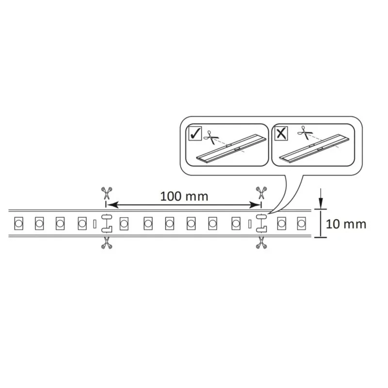 - Możliwość cięcia w wyznaczonych miejscach co 10 cm = 6 x LED – miejsce cięcia oznaczone na taśmie LED
