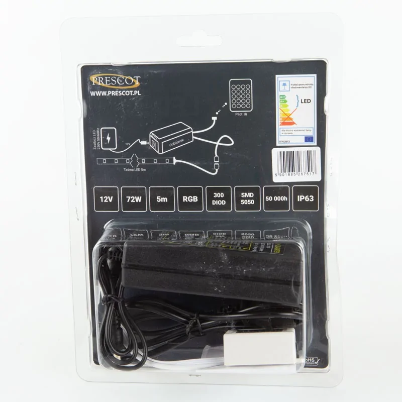 Taśma LED 5m z pilotem PRZ-RGB-IP72W-24K LED RGB 300LED SMD5050 12V 72W 5m IP63 pilot 24 przyc. PRESCOT