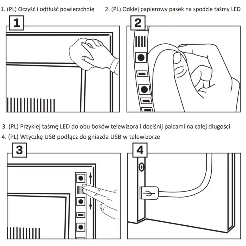 Taśma LED marki POLUX-GOLDLUX przeznaczona jest do dekoracyjnego podświetlenia telewizora lub monitora. Do zestawu dołączony został również pilot za pomocą, którego możesz włączyć i wyłączyć taśmę, zmienić jej barwę światła czy natężenie. Prezentowany model taśmy LED przeznaczony jest do montażu z tyłu telewizora lub monitora. Wystarczy przykleić ją po bokach, a wtyczkę USB podłączyć do gniazda USB w telewizorze. Dodatkowo produkt świeci wielokolorową barwą światła, działa z maksymalną mocą do 8W i posiada funkcję muzyczną- świeci w rytm muzyki. Taśma LED zawiera 44 diody RGB oraz 44 diody białe.