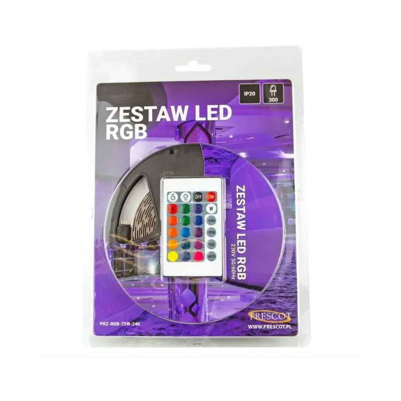 Taśma led z pilotem marki PRESCOT o długości pięciu metrów przeznaczona jest do użytku wewnętrznego ze względu na klasę szczelności IP20. Taśma led charakteryzuje się bardzo długą żywotnością sięgającą nawet 50000 godzin. Taśma led składa się z kolorowych diod RGB, których kolory można zmieniać we wszelaki sposób za pomocą dołączonego do zestawu pilota. Taśmę led można umieścić w dowolnym miejscu, a jej montaż jest banalnie prosty. Zestaw led posiada dwustronną taśmę klejącą dzięki której można zainstalować oświetlenie wszędzie tam, gdzie tylko jest taka potrzeba. Istnieje możliwość dopasowania długości led-owej taśmy do własnych potrzeb, gdyż można ją obcinać co 5 centymetrów.