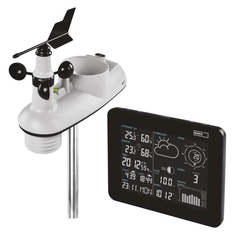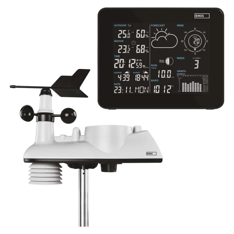 Nowoczesna stacja pogodowa bezprzewodowa z czujnikiem na baterie E5059 firmy EMOS to stacja z aplikacją na telefon. Stacja posiada czytelny wyświetlacz najnowszej technologii, co zapewnia świetną widoczność pod wszystkimi kątami. Stacja pogodowa została wyposażona w budzik, powtarzane budzenie, zegar sterowany sygnałem radiowym, pomiar wilgotności zewnętrznej i wewnętrznej, barometr, wiatromierz czy fazy księżyca. Szeroki zakres temperaturowy i doskonała czułość czujnika o zasięgu do 50m sprawia, że stacja pokazuje dokładną temperaturę panującą wewnątrz oraz na zewnątrz. Stacja posiada funkcję prognozowania pogody.