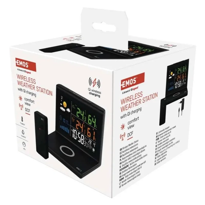 Stacja meteorologiczna E3810 marki EMOS to nowoczesne urządzenie, które pomoże Ci przygotować się na różną pogodę a. Produkt może być również świetnym prezentem. Stacja pogodowa posiada duży czytelny, podświetlany wyświetlacz, który wskazuje temperaturę wewnętrzną i zewnętrzną, datę, godzinę czy wilgotność. Prezentowana stacja meteorologiczna zasilana jest dwoma bateriami AA, a czujnik dwoma cienkimi paluszkami AAA- brak w zestawie. Wymiary wyświetlacza to 110x73mm. Dodatkowo stajca może być zasilana zasilaczem - zasilacz w zestawie. Zasięg czujnika stacji wynosi do 100m. Stacja dodatkowo posiada funkcję bezprzewodowego ładowania telefonów oraz wiele przydatnych możliwości : jak pomiar temperatury, wilgotności, barometr, zegar, kalendarz, fazy księżyca , trend pogodowy oraz możliwość rozbudowania o dodatkowe czujniki
