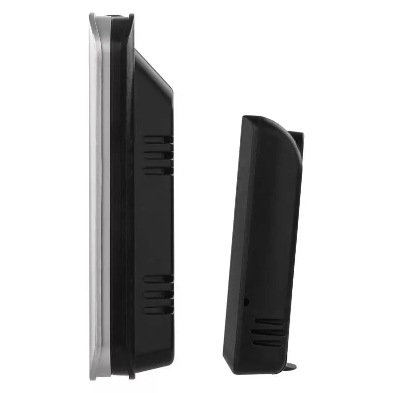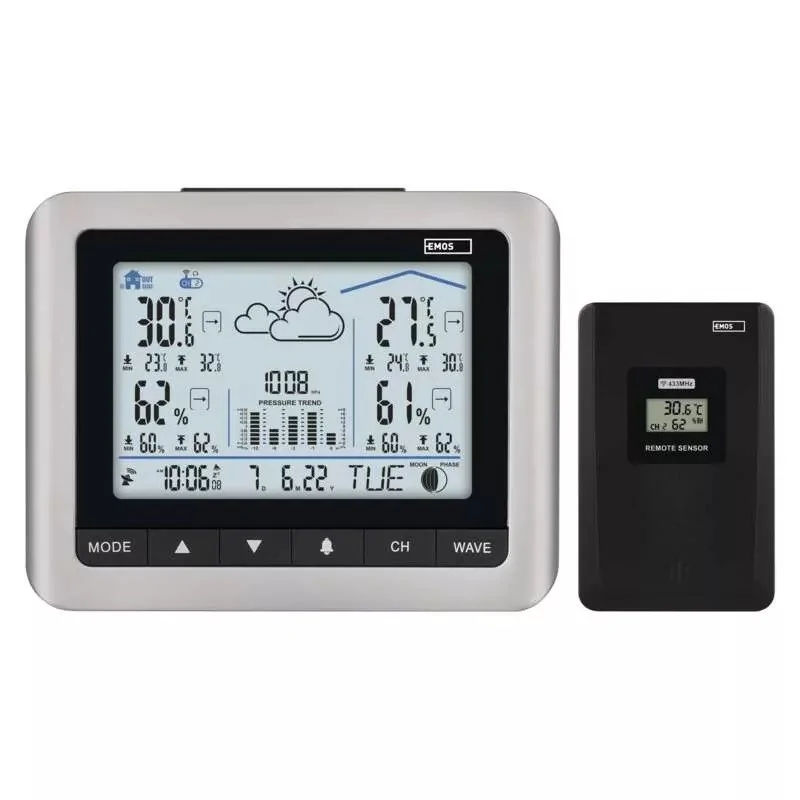 Stacja pogodowa marki EMOS to urządzenie służące do monitorowania temperatury wewnątrz, jak i na zewnątrz. Produkt posiada czujnik o zasięgu do 60m, który zasilany jest dwoma bateriami AA (brak w zestawie). Stacja meteorologiczna wyposażona została w czytelny wyświetlacz o wymiarach: 110 x 73 mm, na którym wskazywana jest temperatura, data, czas oraz prognoza pogody. Urządzenie główne zasilane jest trzema bateriami AAA- brak w zestawie. Stacja wyposażona jest w zegar DCF sterowany sygnałem radiowym. Do stacji mozną podpiać 3 czujniki.
