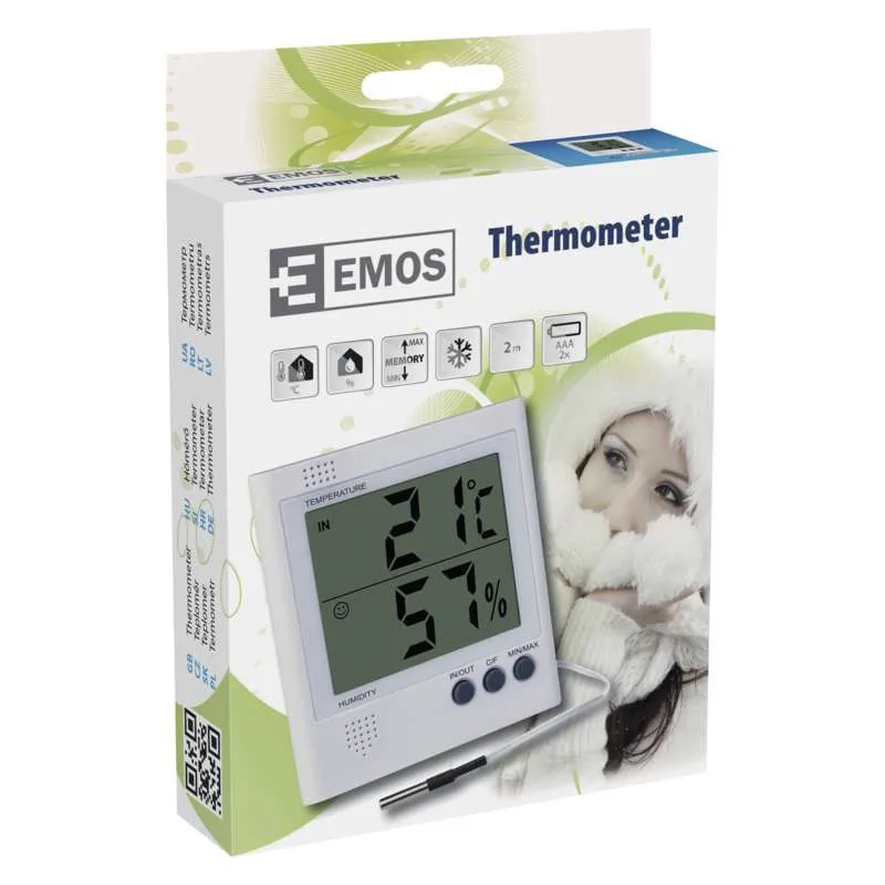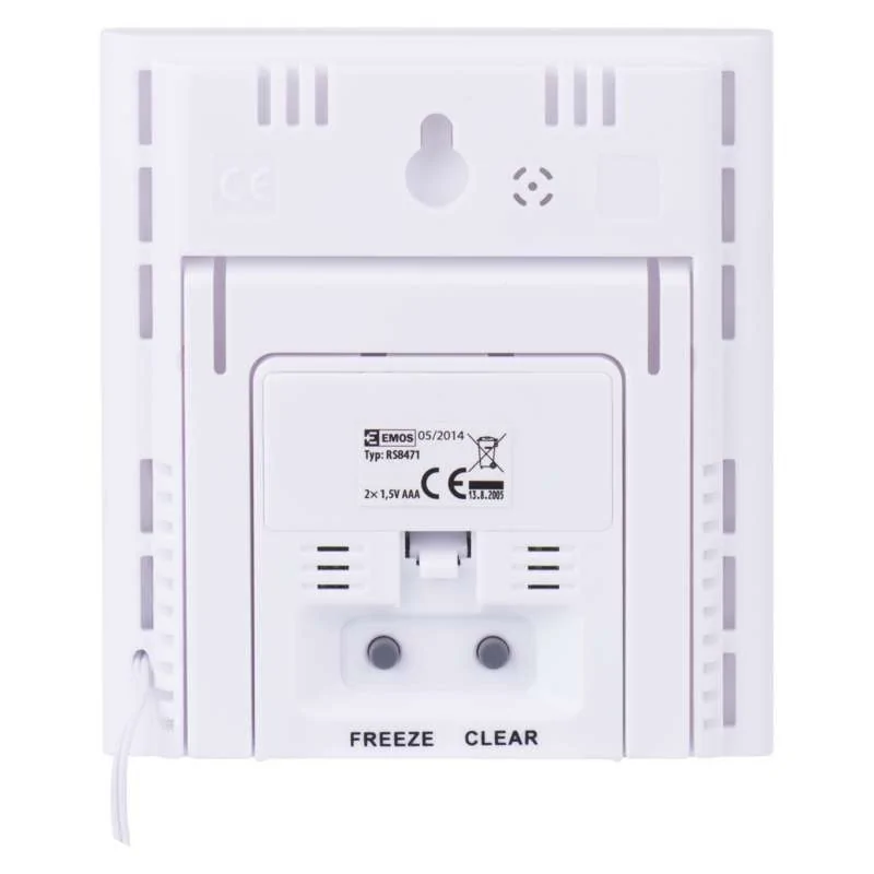 Termometr cyfrowy E8471 marki EMOS w kolorze białym służy do mierzenia temperatury wewnątrz, jak i na zewnątrz. Na jego wyświetlaczu pokazana jest panująca temperatura w danym otoczeniu. Produkt został również wyposażony w funcję zapamiętywania minimalnej oraz maksymalnej temperatury. Termometr firmy EMOS posiada sondę o długości 2m oraz ostrzega przed gołoledzią. Prezentowany model posiada szeroki zakres temperatury: wewnętrzna- -10 °C do +50 °C, rozdzielczość 0,1 °C, zewnętrzna- -50 °C do +70 °C, rozdzielczość 0,1 °C. Stacja pogodowa zasilana jest jedną baterią 1,5V AAA (brak w zestawie).