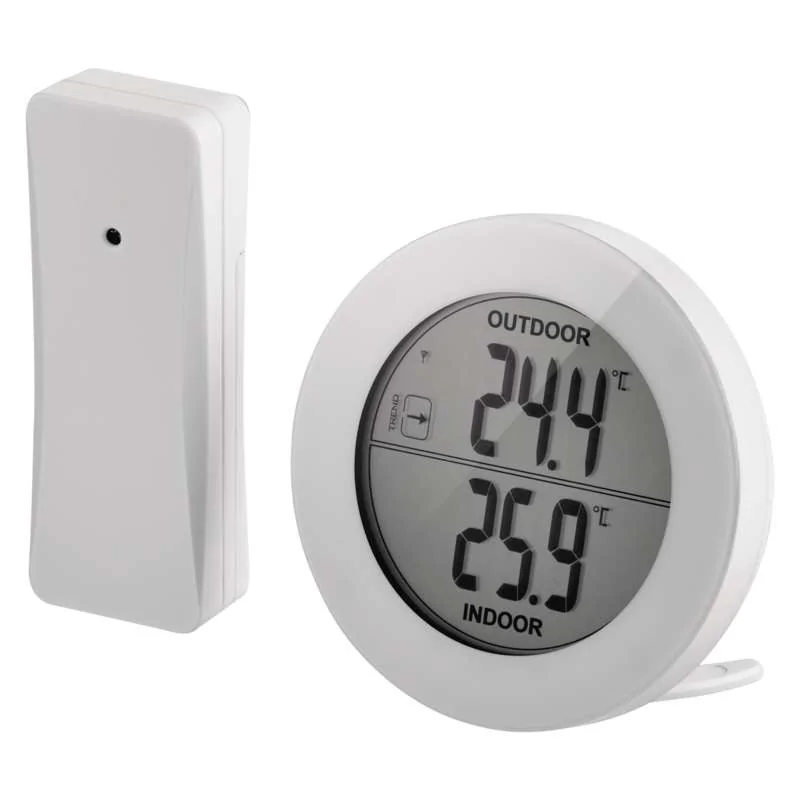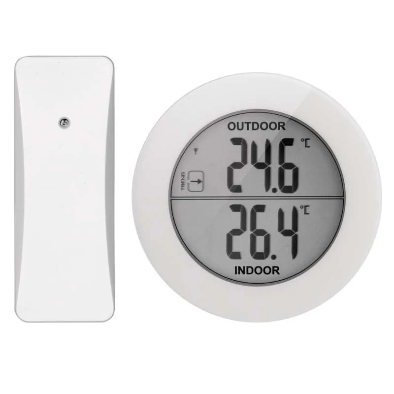 Biały okrągły termometr cyfrowy E0129 firmy EMOS to doskonałe urządzenie, które znajdzie zastosowanie w każdym domu. Produkt służy do mierzenia temperatury wewnętrznej oraz zewnętrznej. Stacja pogodowa wyposażona jest w wyświetlacz, na którym ukazana jest wartość temperatury. Model ten posiada czujnik bezprzewodowy o dużej czułości i zasięgu w przestrzeni otwartej do 80m. Termometr marki EMOS został wyposażony również w funkcję zapamiętywania minimalnej oraz maksymalnej temperatury. Produkt posiada szeroki zakres temperatury: wewnętrzna- -10 °C do +50 °C, rozdzielczość 0,1 °C, zewnętrzna- -30 °C do +50 °C, rozdzielczość 0,1 °C.