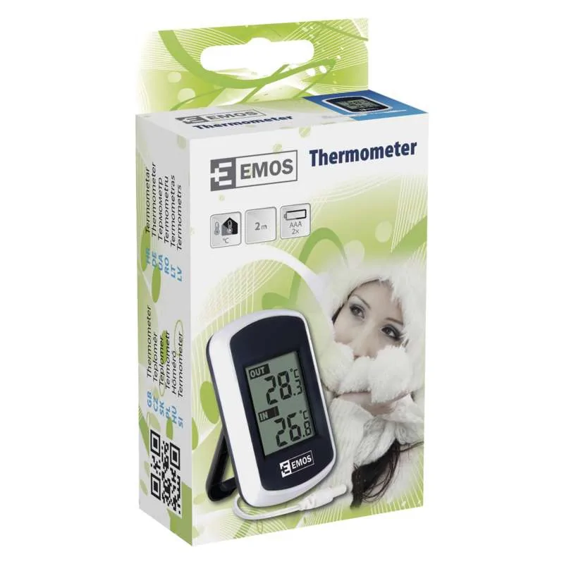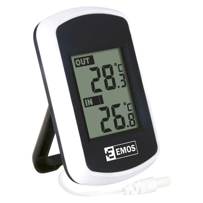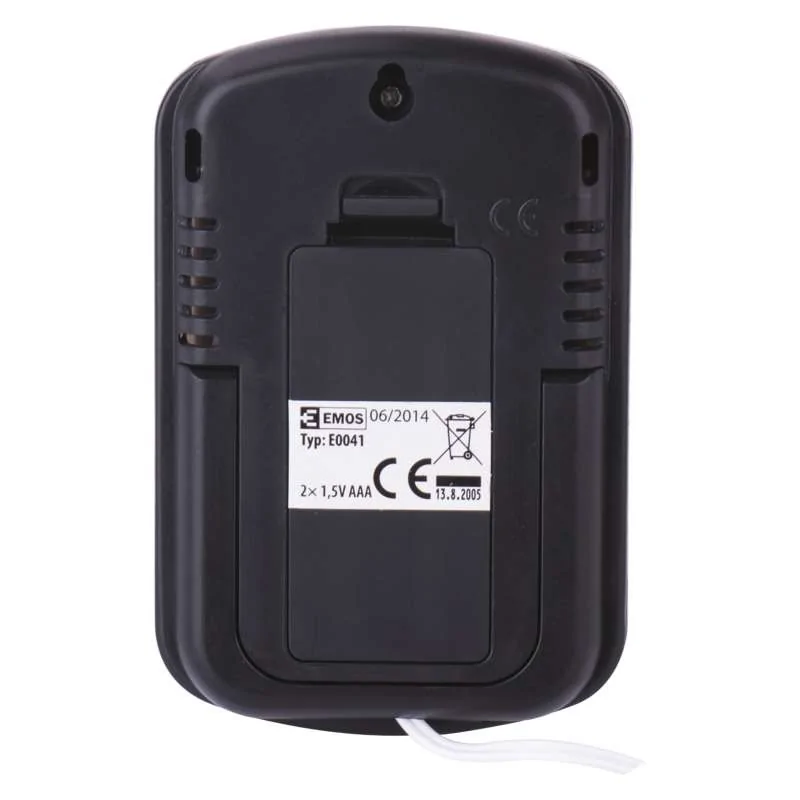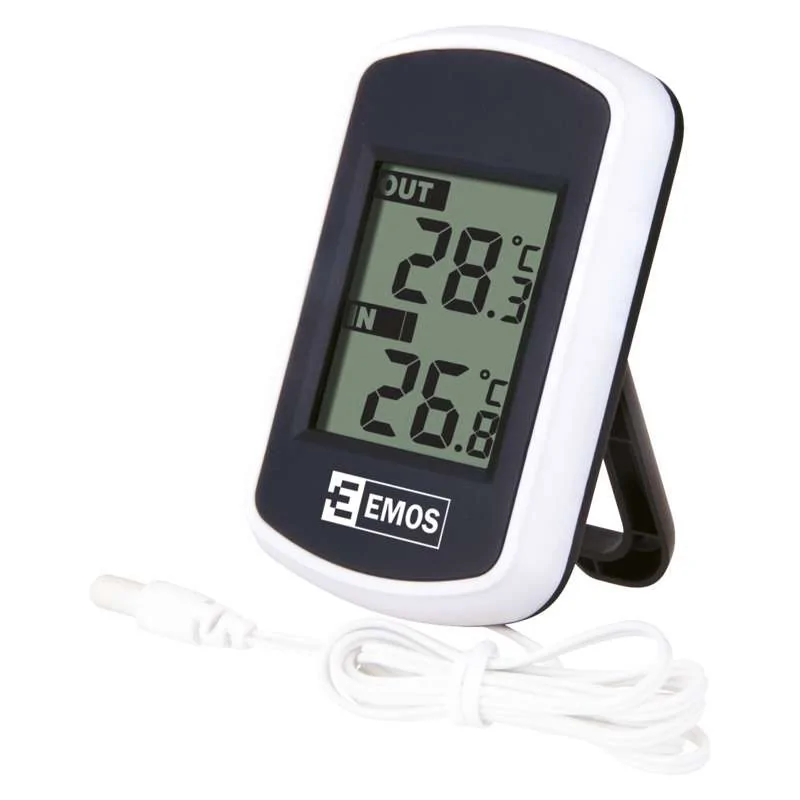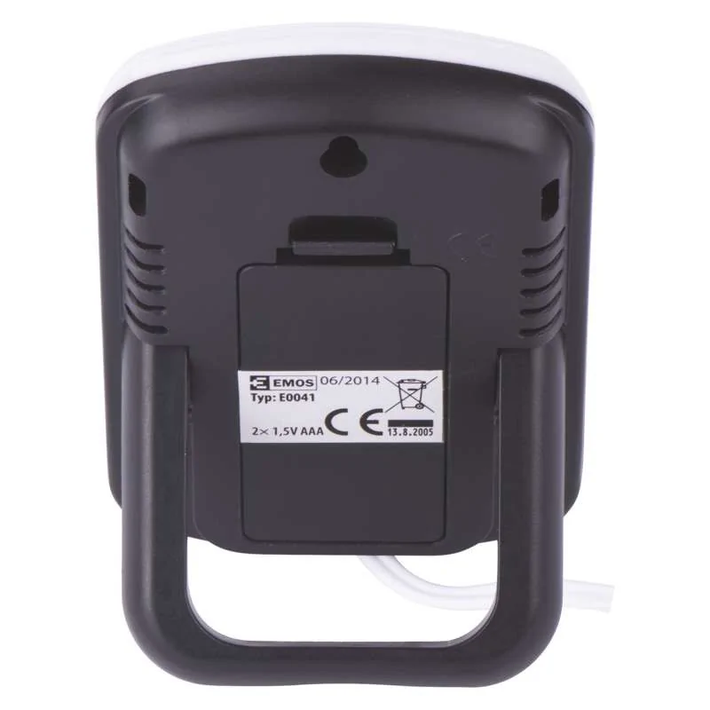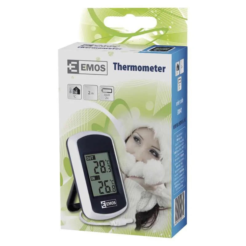 Termometr cyfrowy E0041 firmy EMOS jest w kolorze czarnym z dodatkiem białego. Produkt został wyposażony w wyświetlacz, na którym ukazana jest temperatura zewnętrzna oraz wewnętrzna. Termometr posiada sondę przewodową o długości 2m. Prezentowany model stacji pogodowej można bez problemu zawiesić na ścianie. Niewielki wymiar produktu sprawia, że nie zajmie on dużo miejsca. Termometr cyfrowy jest bardzo prosty w obsłudze oraz montażu. Produkt zasilany jest dwoma bateriami 2x1,5V AAA (brak w zestawie).
