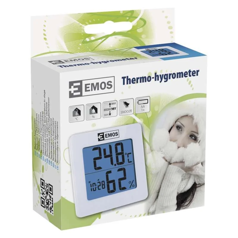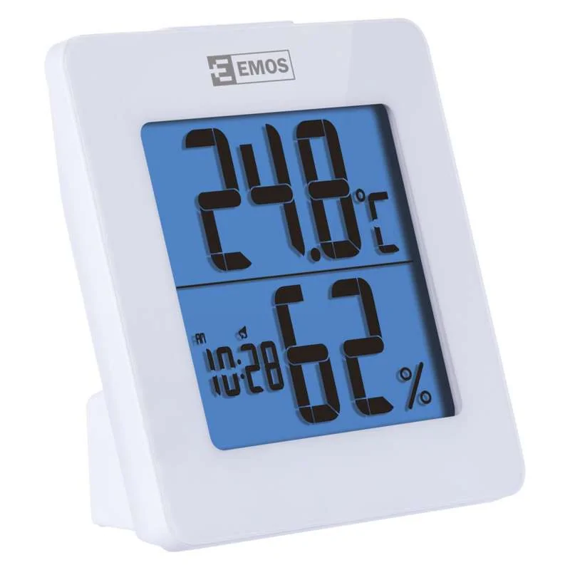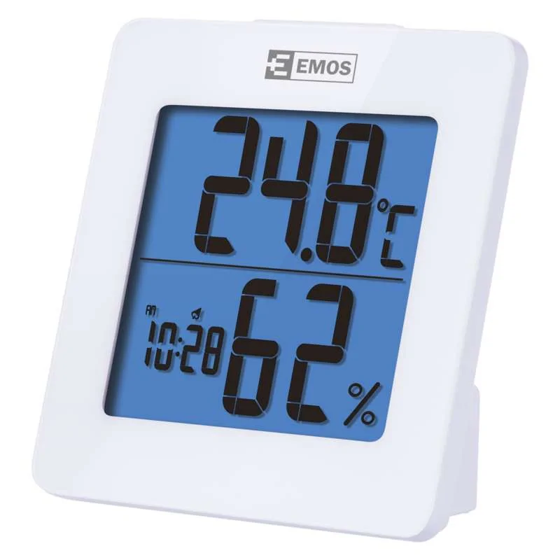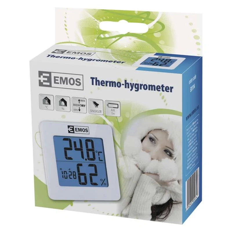 Termometr z wyświetlaczem E0114 pochodzący od znanej firmy EMOS zasilany jest pojedynczą baterią AA 1,5V, której brak w zestawie. Biały kolor obudowy wpadnie w gust każdemu. Wyświetlacz podświetlany jest na niebiesko, a na nim ukazana jest temperatura zewnętrzna, poziom wilgoci oraz godzina. Termometr wyposażony został w higrometr, który mierzy wilgotność wewnętrz pomieszczeń w przedziale 25%-95%. Produkt został wyposażony również w funkcję budzika, a także pokazuje czas i datę. Wymiary wyświetlacza to: 65 x 60 mm.