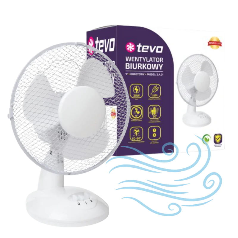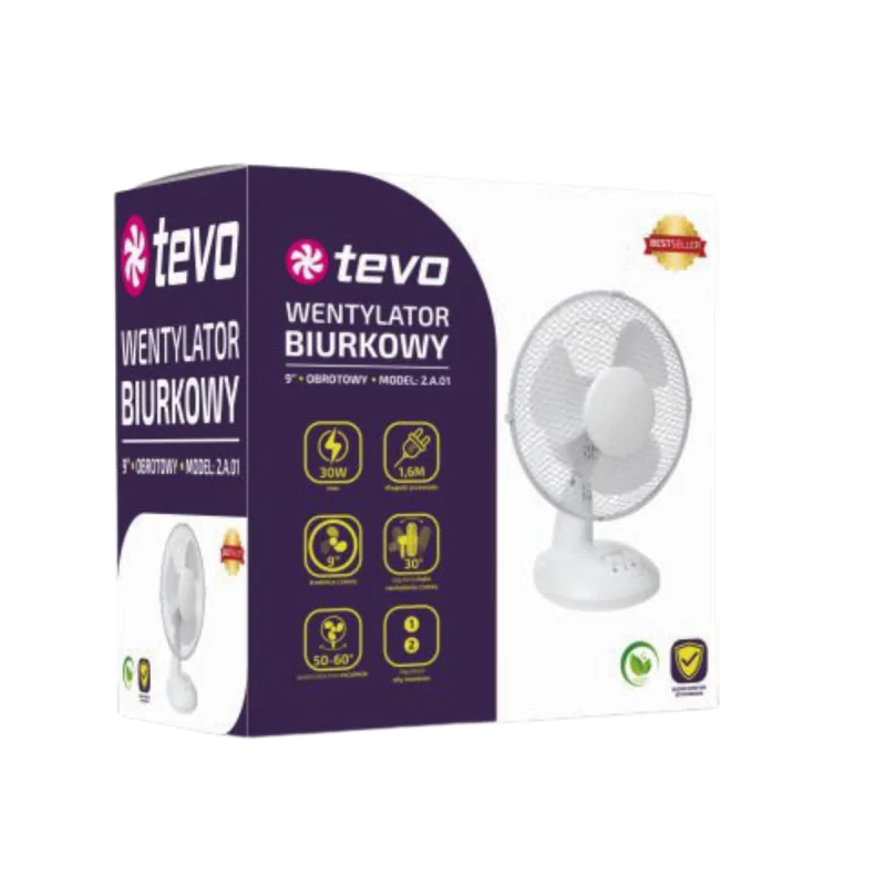 Wentylator biurkowy TEVO 9’’ to idealne rozwiązanie na upalne dni – zarówno w pracy, jak i w domowym zaciszu. Dzięki kompaktowej konstrukcji w eleganckim, białym kolorze, urządzenie świetnie komponuje się z każdym wnętrzem i zmieści się nawet na niewielkim blacie. Solidna podstawa zapewnia stabilność, a intuicyjna obsługa sprawia, że wentylator jest wygodny w codziennym użytkowaniu.