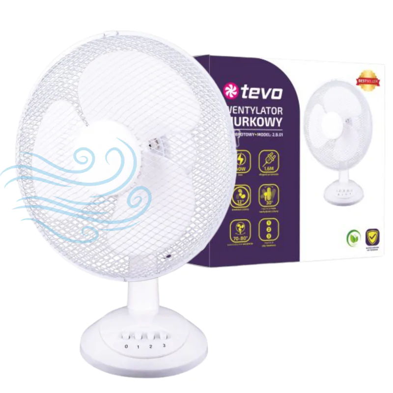 Wentylator biurkowy obrotowy biały TEVO to niezawodne rozwiązanie na upalne dni w domu i biurze. Dzięki kompaktowej formie z łatwością zmieści się na biurku, komodzie czy stoliku nocnym, zapewniając przyjemny chłód tam, gdzie go najbardziej potrzebujesz. Uniwersalny biały kolor sprawia, że wentylator doskonale komponuje się z nowoczesnym i klasycznym wnętrzem, nie zakłócając estetyki pomieszczenia.