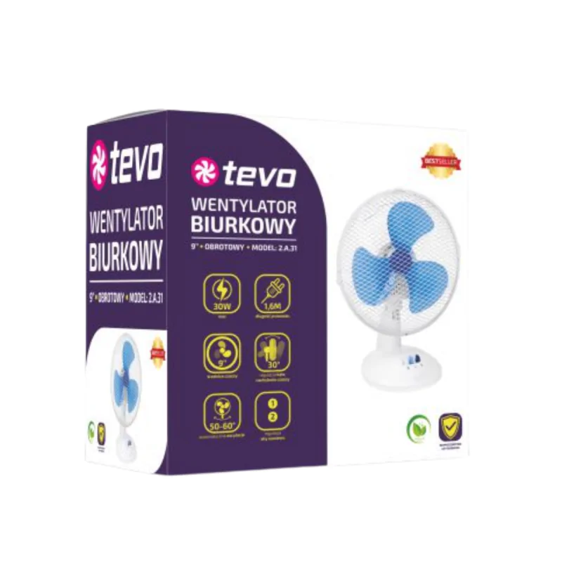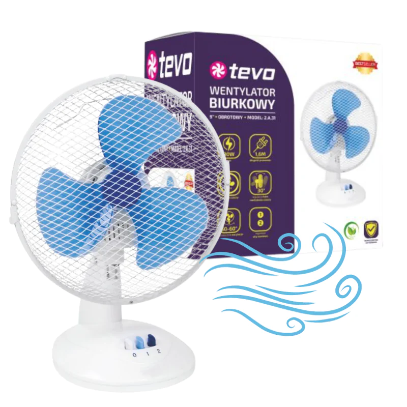 Wentylator biurkowy obrotowy 9'' TEVO to niezawodne rozwiązanie na upalne dni, które łączy wydajność z nowoczesnym wyglądem. Dzięki zgrabnej formie i lekkiej konstrukcji, doskonale sprawdzi się zarówno w biurze, jak i w domowym zaciszu. Jego przemyślany design w biało-niebieskiej kolorystyce świetnie komponuje się z różnymi aranżacjami wnętrz, dodając im świeżości i funkcjonalności.