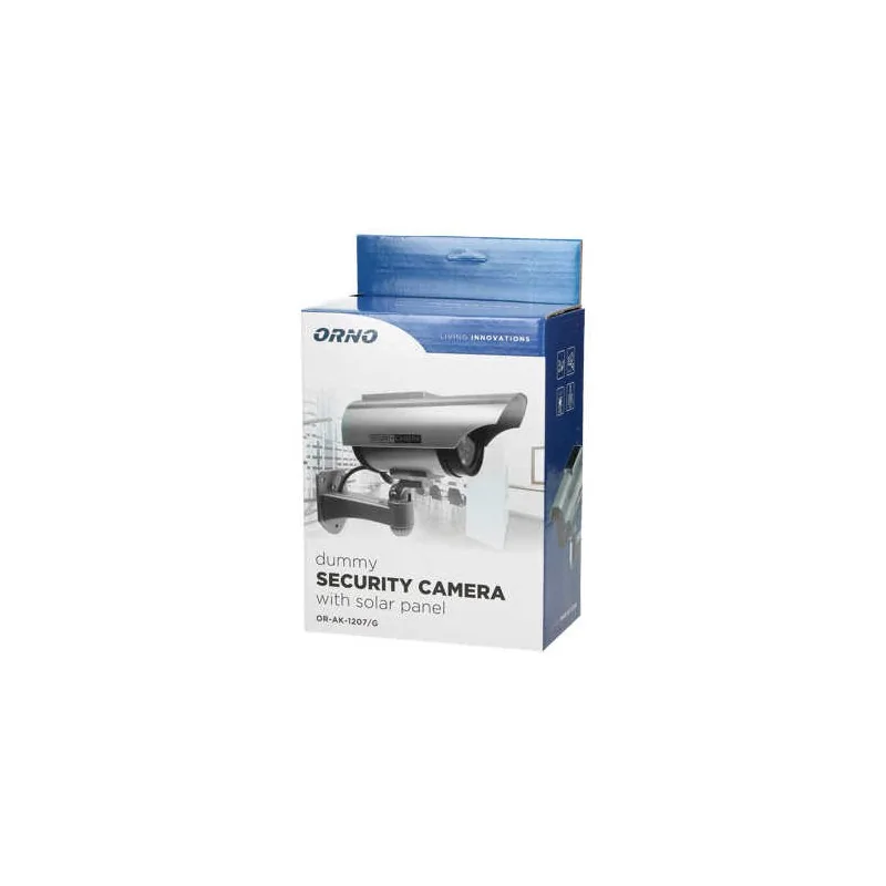 Atrapa kamery monitorującej OR-AK-1207/G firmy ORNO wyposażona została w migającą diodę led i zasilana jest panelem solarnym. Urządzenie to nie różni się wyglądem od prawdziwej kamery monitorującej i daje wrażenie ciągłego monitoringu. Produkt przeznaczony jest do użytku wewnątrz, jak i na zewnątrz, a jego średnica równa jest 7 cm. Atrapa kamery marki ORNO zasilana jest dwoma bateriami AA (brak w zestawie) i posiada obudowę w kolorze srebrnym.