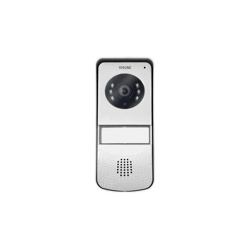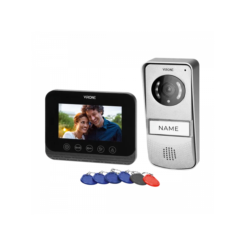 Elegancki wideodomofon jednorodzinny Virone nie wymaga słuchawki. Zestaw składa się z kolorowego płaskiego monitora LCD o wielkości 4,3'', na którym znajdują się dotykowe przyciski, za pomocą których jest obsługiwany. Zestaw składa się również z odpornej wideo kasety z czytnikiem kart i breloków zbliżeniowych oraz jasnymi diodami LED, które zapewniają widzenie po zmroku. Prezentowane urządzenie posiada możliwość płynnej regulacji parametrów monitora oraz 6 dźwięków dzwonka do wyboru. Zestaw wideodomofonowy posiada również funkcję sterowania bramą oraz otwierania elektrozaczepu zasilanego bezpośrednio z wideo kasety.