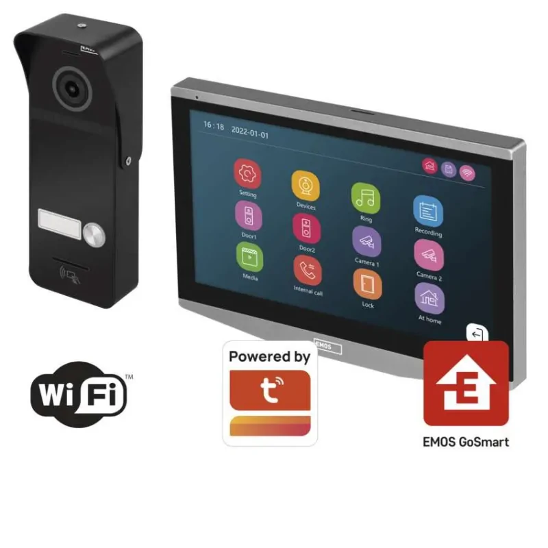 Wideodomofon GoSmart marki EMOS to nowoczesne urządzenie inteligentne, które pomoże Ci kontrolować to co dzieje się w Twoim domu i zapewnić mu ochronę nawet, gdy jesteś poza nim. Dzięki temu urządzeniu nigdy nie przegapisz ważnej wizyty. Produkt wyposażony został w 7-calowy monitor LCD i za pomocą jego lub aplikacji na telefon możesz dwustronnie komunikować się z Twoimi gośćmi. Kamera zewnętrzna wyposażona została w czujnik ruchu, który po wykryciu ruchu za Twoimi drzwiami wysyła powiadomienie na telefon. Wideodomofon GoSmart posiada funkcję nagrywania wideo i zapisywania go na karcie micro SD lub w chmurze, dzięki czemu zawsze będziesz wiedzieć o każdej wizycie w Twoim domu podczas Twojej nieobecności. Za pomocą dwukierunkowej komunikacji głosowej możesz podczas Twojej nieobecności przekierować doręczyciela do sąsiada lub poinformować swojego gościa o godzinie Twojego powrotu. Dodatkowo możesz nagrać wiadomość, która będzie automatycznie odtwarzana po naciśnięciu dzwonka. Dużą zaletą prezentowanego inteligentnego wideodomofonu jest również to, że pomimo Twojej nieobecności w domu możesz zdalnie otworzyć drzwi np. Twojemu dziecku po powrocie ze szkoły. Możesz rozbudować wideodomofon do nawet 6 monitorów LCD. Po instalacji produktu należy połączyć go z domową siecią Wi-Fi i sparować go z aplikacją mobilną GoSmart. Aplikacja GoSmart zapewnia bezpieczeństwo i kompatybilność danych, dzięki globalnej platformie TUYA, która jest podstawą systemu Emos GoSmart.