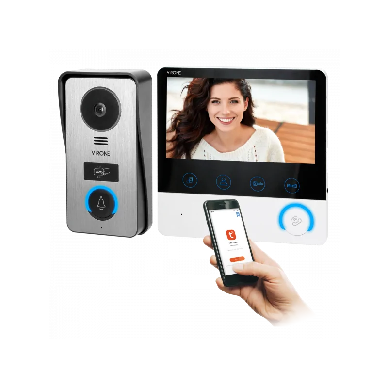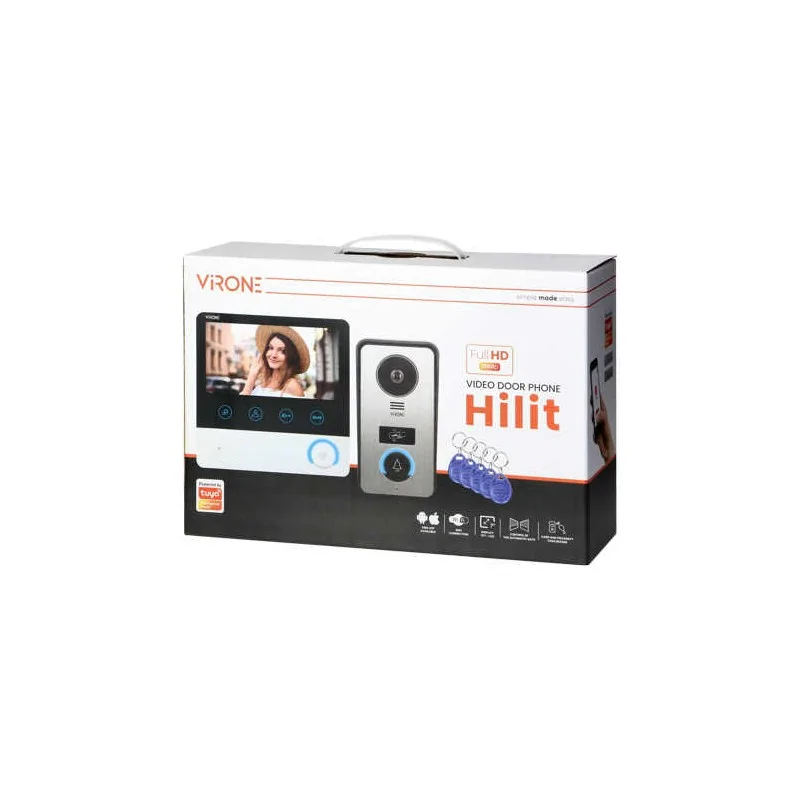 Zestaw wideodomofonowy jednorodzinny HILIT Virone to nowoczesne urządzenie z kolorowym i ultra płaskim monitorem LCD o przekątnej 7''. Wideodomofon wykonany został z wysokiej jakości materiałów odpornych, a panel zewnętrzny wyposażony został w daszek, który chroni przed opadami deszczu oraz przed ostrym promieniowaniem słonecznym. Komunikacja między panelem wewnętrznym a zewnętrznym nie wymaga słuchawki. Po pobraniu darmowej aplikacji Tuya możesz sterować urządzeniem ze swojego smartfonu. Kaseta została oświetlona diodami IR, które umożliwiają świecenie nocą.