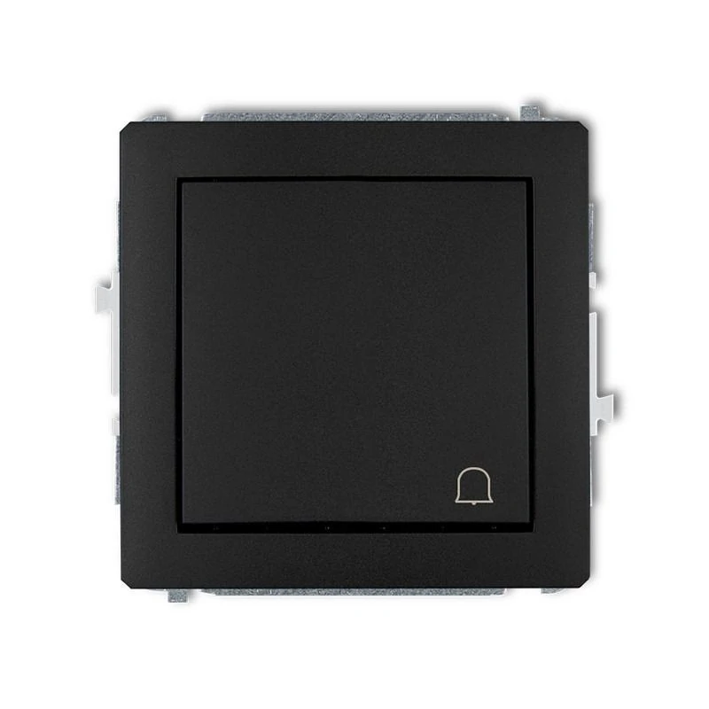 Przycisk dzwonkowy w kolorze czarnym serii DECO firmy KARLIK, przeznaczony do montażu podtynkowego. Przycisk wymaga dokupienia ramki serii DECO firmy KARLIK.