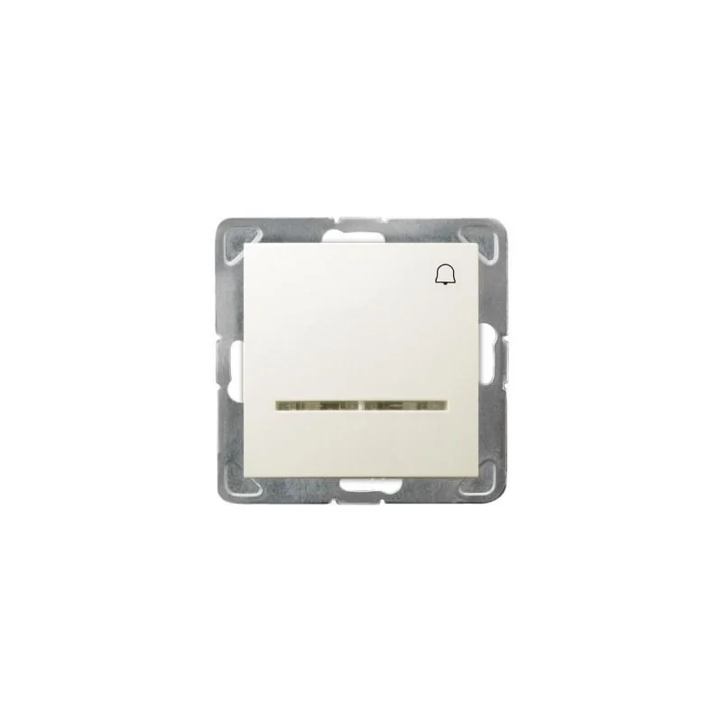Przycisk dzwonkowy w kolorze ECRU z podświetleniem serii IMPRESJA firmy OSPEL, przeznaczony do montażu podtynkowego. Przycisk wymaga dokupienia ramki serii IMPRESJA firmy OSPEL.