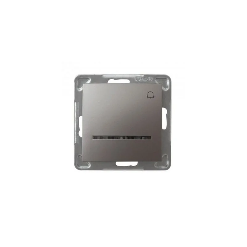 Przycisk dzwonkowy tytanowy z podświetleniem serii IMPRESJA firmy OSPEL, przeznaczony do montażu podtynkowego. Przycisk wymaga dokupienia ramki serii IMPRESJA firmy OSPEL.