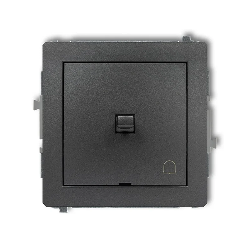 Zwierny przycisk dzwonkowy amerykański serii DECO polskiej marki KARLIK przeznaczony jest do montażu podtynkowego. Produkt wyposażony został w klawisz dźwigniowy, który po naciśnięciu odbija. W dolnym rogu został również umieszczony piktogram dzwonka. Włączniki amerykańskie nie wstępują w wersji hermetycznej, dlatego nie ma możliwości zastosowania w nich uszczelniacza. Istnieje natomiast możliwość zamontowania modułu podświetlającego. Grafitowy przycisk dzwonkowy amerykański sprzedawany jest bez ramki w zestawie. W serii DECO dostępne są ramki w krotnościach 1-5 w różnych kolorach. W ofercie znajdują się również ramki wypełniające- niweluje szczelinę pomiędzy ramką standardową, a ścianą (opcja dodatkowa) oraz pośrednie w bogatej kolorystyce, co pozwala na stworzenie własnej kompozycji.