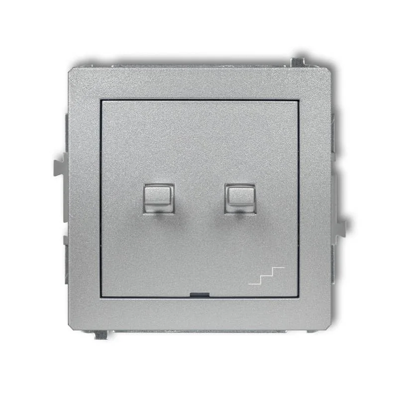 Włącznik schodowy podwójny w stylu amerykańskim 7DWPUS-33 serii DECO marki KARLIK przeznaczony jest do montażu podtynkowego oraz sprzedawany jest bez ramki w zestawie. Włączniki amerykańskie nie występują w wersji hermetycznej IP44, dlatego nie można dokupić do nich uszczelniacza U-1. Łączniki występują również w wersji podświetlanej (dokupić moduł L-1, L-2, 2L-2, 2L-2, 17L-2). Produkt jest w kolorze srebrnym metalicznym i posiada piktogram schodów w prawym dolnym rogu, dzięki czemu łatwo go odróżnić. Przeznaczony jest tylko do użytku wewnętrznego. Do włącznika schodowego podwójnego w stylu amerykańskim nie ma możliwości zastosowania modułu podświetlającego.
