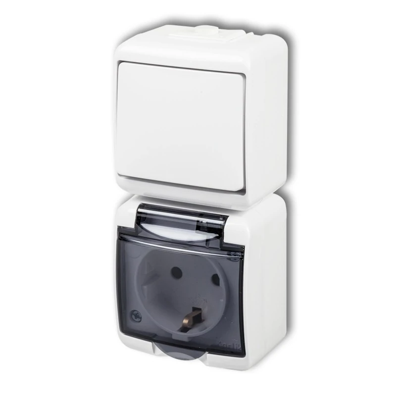 Zestaw WGHP-1sdp to mix pionowy stanowiący połączenie przełącznika światła z gniazdem hermetycznym z uziemieniem typu schuko z dymną klapką. Komplet przeznaczony jest do montażu natynkowego. Gniazdo w komplecie posiada uziemienie ( bolec na dole ) oraz odznacza się bryzgoszczelnością, natomiast łącznik jednobiegunowy może pełnić rolę włącznika i wyłącznika światła w Twoim garażu czy warsztacie. Takie funkcjonalne połączenia kontaktu z włącznikiem ułatwia znacznie organizację pracy. Zestawienie WGHP-1 w klasycznej białej barwie przeznaczone jest do montażu natynkowego na ścianach pomieszczeń, w których istnieje zwiększone narażenie na pojawienie się wilgoci lub pyłów. Produkt odznacza się wysoką jakością wykonania - pochodzi z polskiej linii produkcyjnej firmy KARLIK. Model posiada przesłony torów prądowych.