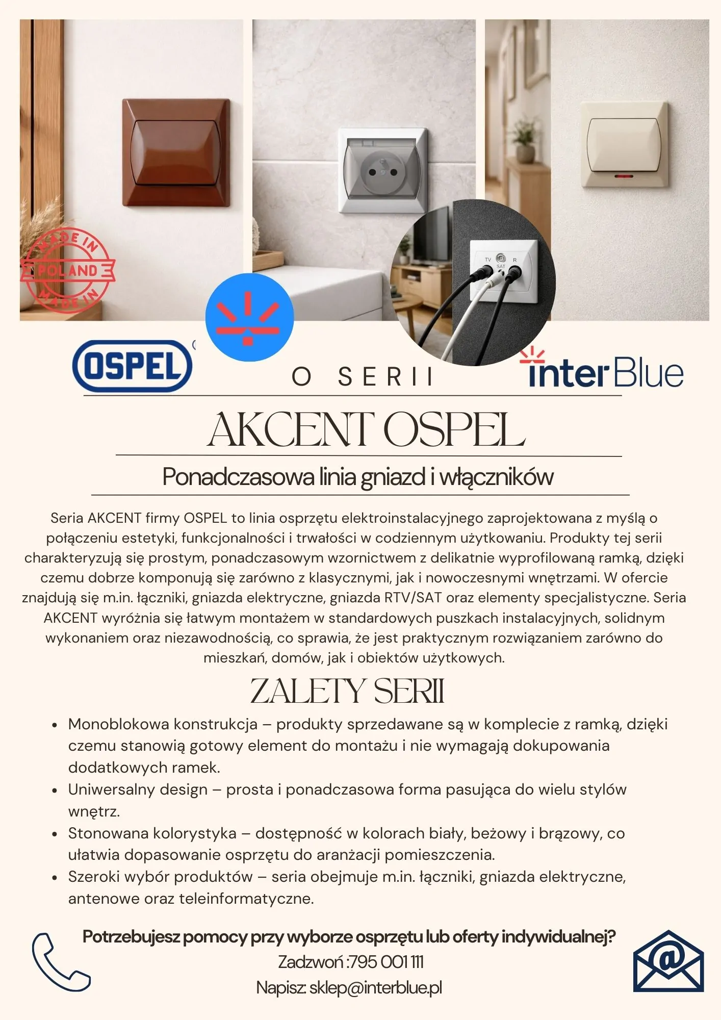 Wyłącznik jednobiegunowy z podświetleniem ŁP-1AS/01 serii AKCENT firmy OSPEL przeznaczony jest do montażu podtynkowego oraz wyposażony jest w ramkę w komplecie. Łącznik pojedynczy jest w kolorze beżowym, dzięki czemu idealnie spisze się w każdym pomieszczeniu. Włącznik z podświetleniem posiada stopień odporności IP20, a jego wymiary to: szerokość- 82 mm, wysokość- 82 mm, głębokość- 36 mm, głębokość wbudowania- 23 mm. W ofercie serii AKCENT firmy OSPEL znajdziesz również inne włączniki z 2-letnią gwarancją.