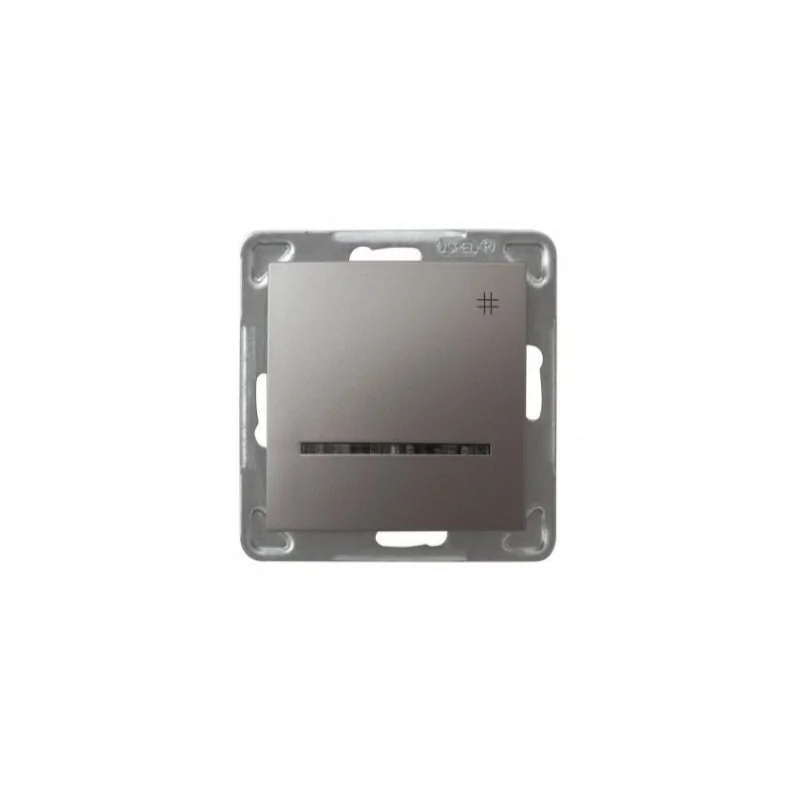 Tytanowy włącznik krzyżowy z podświetleniem pomarańczowym serii IMPRESJA firmy OSPEL, przeznaczony do montażu podtynkowego. Włącznik wymaga dokupienia ramki serii IMPRESJA firmy OSPEL.