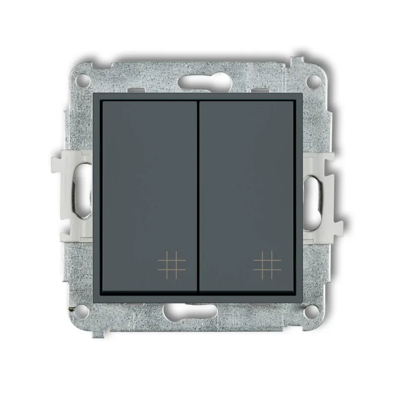 Włącznik krzyżowy podwójny serii ICON marki KARLIK przeznaczony jest do montażu podtynkowego. Produkt sprzedawany jest bez ramki w zestawie i wyposażony został w dwa klawisze w kolorze grafitowym matowym z piktogramem. Do prawidłowego montażu należy osobno dokupić uniwersalną, standardową ramkę instalacyjną tej samej serii ICON firmy KARLIK. Ramki dostępne są w różnych wersjach kolorystycznych oraz kształtach (okrągły, zaokrąglony, kwadratowy), w krotnościach 1-5. Każdy mechanizm wyposażony jest w zestawie w ramkę pośrednią w kolorze mechanizmu, którą można wymienić. Ramki pośrednie dostępne są w 20 kolorach.